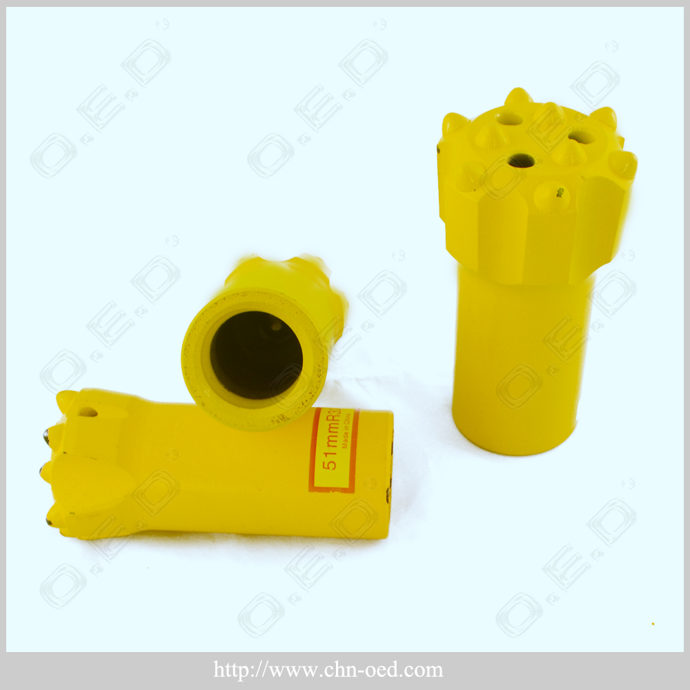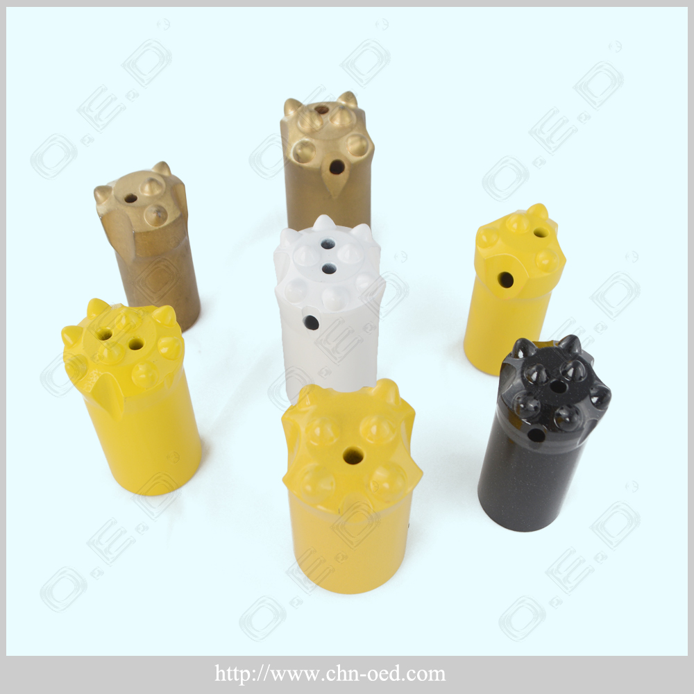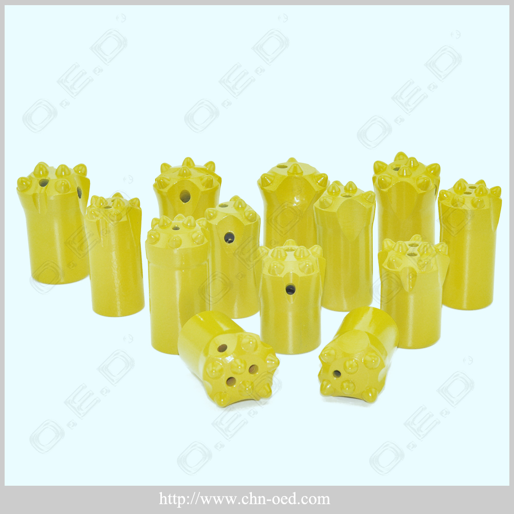 We can design and manufacture according to customers' samples or drawings of the Bit Dia., No. of air / water holes, carbide button shape and the face shape. Our button bit is made with high quality of best quality alloy steel bar and tungsten carbides, through heat treatment so that it can withstand the toughest rock drilling demands, and transmit intensive impact energy into the rock with the least possible loss of energy. Comparing with tapered chisel bits and tapered cross bits, button bits has higher technology, much longer primary drilling time and higher drilling efficiency. According to the tungsten carbide insert, tapered button bits can be divided into the types of hemispherical, conical and parabolic button, etc.